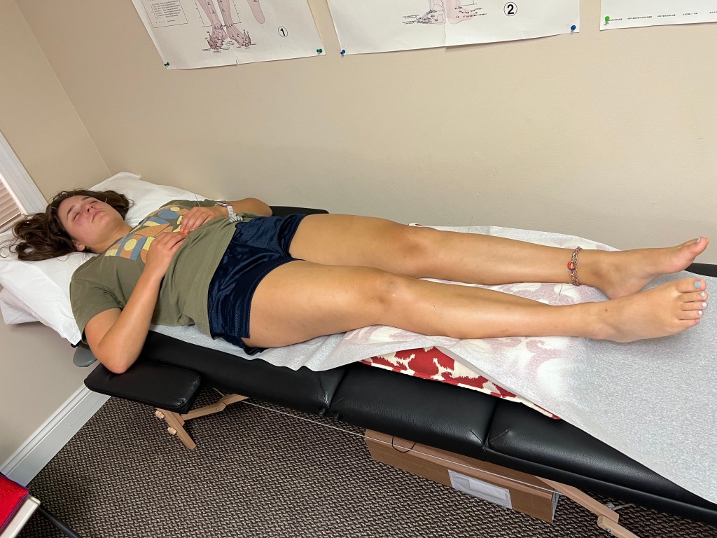 After I sign in, I am shown to a room where I listen to the calming Chinese music play in the background. Dr. Fan comes in the room next, dropping some wisdom or funny comment while he puts a bunch of needles all over haha. He places one needle in my wrist and moves it around until I feel a shooting sensation to my fingertips, which is one of the practices he uses to regulate my autonomic nervous system. Then, he places a heat lamp on my core and I take a little thirty minute nap while the needles do their thing. After thirty minutes Dr. Fan comes back in, removes the needles and I am all set to go. I’ve included some photos (some very bad photos haha) so you can get a sense of what’s going on.